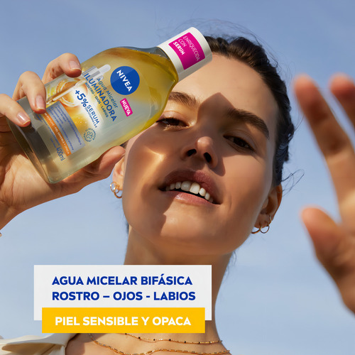 Agua Micelar Bifásica Iluminadora +5% Serum con Vitamina C&E. Para maquillaje a prueba de agua, enriquecida con serum y para una piel más iluminada y uniforme.