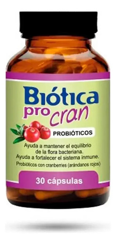 Biótica Pro Cran es un suplemento diseñado para promover la salud intestinal y el bienestar general. Cada frasco contiene 30 cápsulas que combinan probióticos y prebióticos, formulados para ayudar a mantener un equilibrio óptimo de la flora intestinal. Este producto es ideal para quienes buscan mejorar su digestión y fortalecer su sistema inmunológico de manera natural.