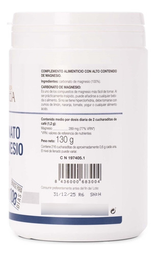 El Carbonato de Magnesio 130 Gr Polvo Sabor Sin Sabor de la reconocida marca Ana María Lajusticia es el suplemento ideal para aquellos que buscan mejorar su bienestar nutricional. Con su fórmula libre de lactosa y gluten, este producto es apto para personas con intolerancias y alergias alimentarias. Además, su formato en polvo lo hace fácil de incorporar en la dieta diaria. Cada porción de 1.2 g contiene 289 mg de magnesio, un mineral esencial para el correcto funcionamiento del organismo. Su uso recomendado es nutricional, por lo que puede ser utilizado como complemento en una alimentación equilibrada. ¡No esperes más y aprovecha los beneficios que el Carbonato de Magnesio de Ana María Lajusticia tiene para ofrecerte!