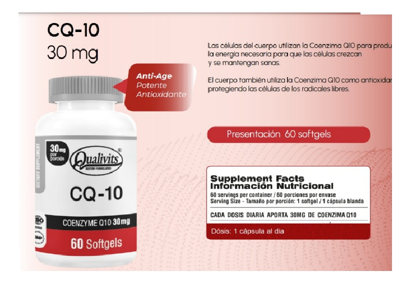 Las células del cuerpo utilizan la Coenzima Q10 para producir la energía necesaria para que las células crezcan y se mantengan sanas. El cuerpo también utiliza la Coenzima Q10 como antioxidante, protegiendo las células de los radicales libres. Este suplemento de la línea Natural de Qualivits no contiene lactosa y es libre de gluten, aunque no es apto para veganos. Cada envase contiene 60 cápsulas (softgels) de 30 mg de Coenzima Q10, presentadas en un práctico pote. Ideal para quienes buscan un apoyo nutricional efectivo y natural. Perfecto para mantener tu cuerpo en óptimas condiciones y proteger tus células.