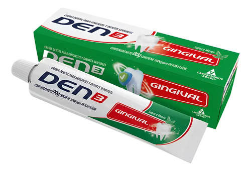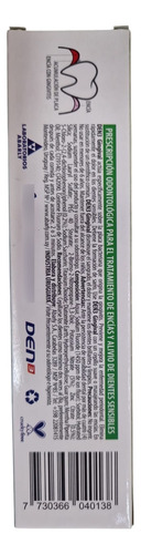 Den3 Gingival es un dentífrico indicado para el tratamiento de la Gingivitis (sangrado de encías), control de placa bacteriana, control de sarro y alivio de los dientes sensibles. Este dentífrico posee una combinación bactericida específica sobre la flora supra y sub-gingival responsable de la colonización del margen de la encía y establecimiento de la enfermedad.