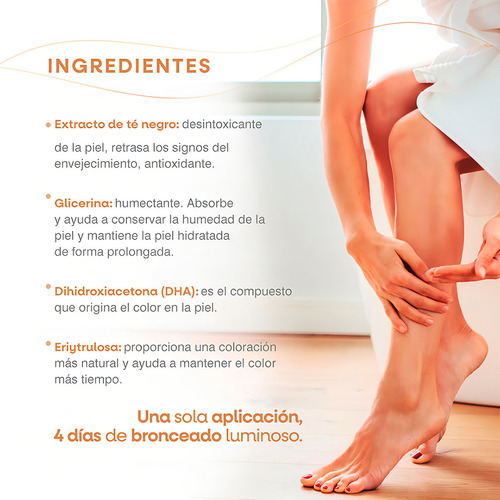 Este autobronceante es fácil de aplicar y se seca rápidamente, permitiéndote vestirte poco después de su uso. Además, es adecuado para todo tipo de piel y proporciona hidratación, gracias a sus componentes nutritivos.