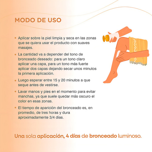 Para un mejor resultado, exfolia tu piel antes de la aplicación y distribuye el producto de manera uniforme. Evita el contacto con agua o sudoración durante las primeras tres horas después de la aplicación para garantizar un desarrollo óptimo del color.