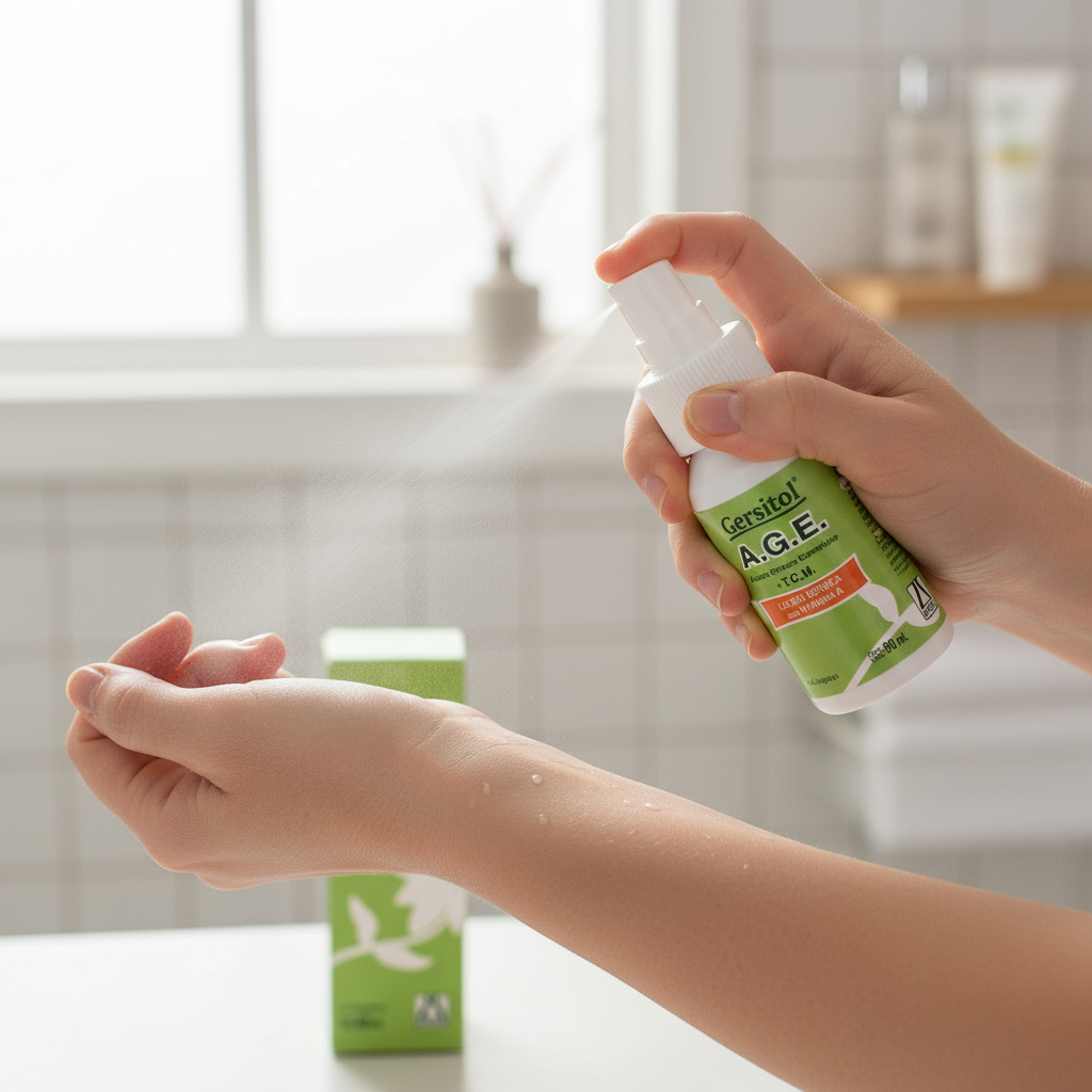 Realizar una o dos pulverizaciones de Gersitol® A.G.E. loción sobre la zona de riesgo o ya fragilizada. Masajear suavemente con las yemas de los dedos facilitando la distribución homogénea. Repetir la aplicación 3 o 4 veces al día con cada cambio postural.