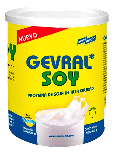Gevral® Soy 400g | Proteína De Soja Sabor Vainilla es un suplemento nutricional pensado para aquellos que buscan optimizar su dieta. Este producto, elaborado por Servimedic S.A., contiene proteína de soja de alta calidad, lo que lo convierte en una opción ideal para complementar dietas vegetarianas y veganas. Su delicioso sabor vainilla hará que disfrutar de tus batidos y recetas sea aún más placentero. Además, su fórmula baja en grasas y libre de colesterol lo convierte en un aliado para cuidar tu salud. Cada porción aporta aminoácidos esenciales que son cruciales para el organismo. Presentado en un práctico pote, este polvo se mezcla fácilmente en tus bebidas favoritas. Si tienes más de 18 años y buscas una solución nutricional versátil y sabrosa, Gevral® Soy es la elección perfecta para ti.