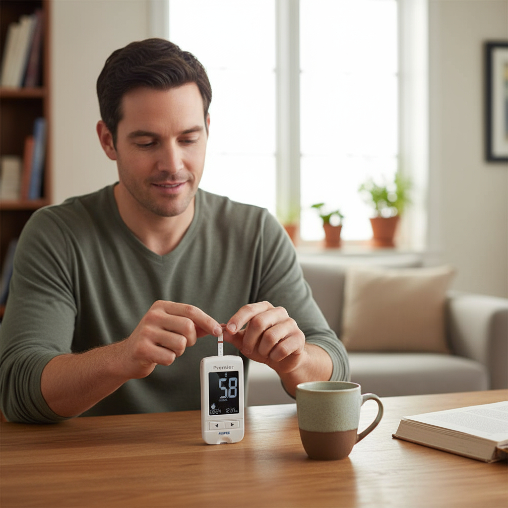 *Memoria de 1,000 pruebas: incluye hora / fecha y un promedio de 1, 7, 14, 30, 90 días de los niveles de glucosa total, pre, post y ayuno.