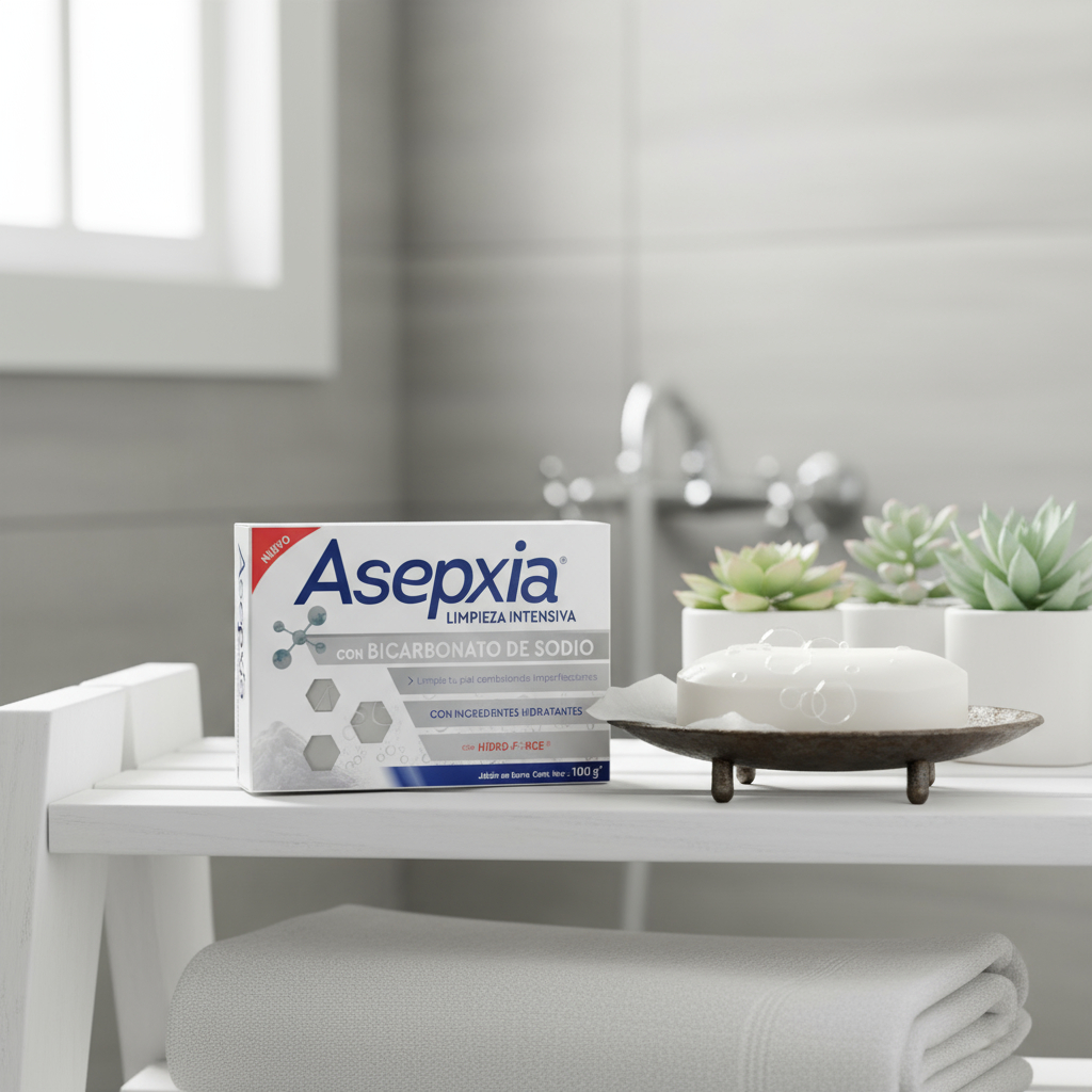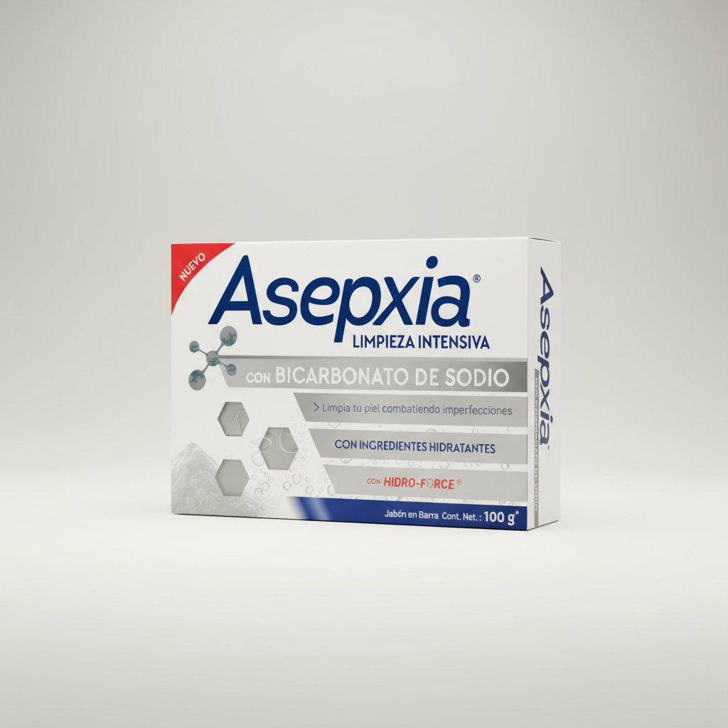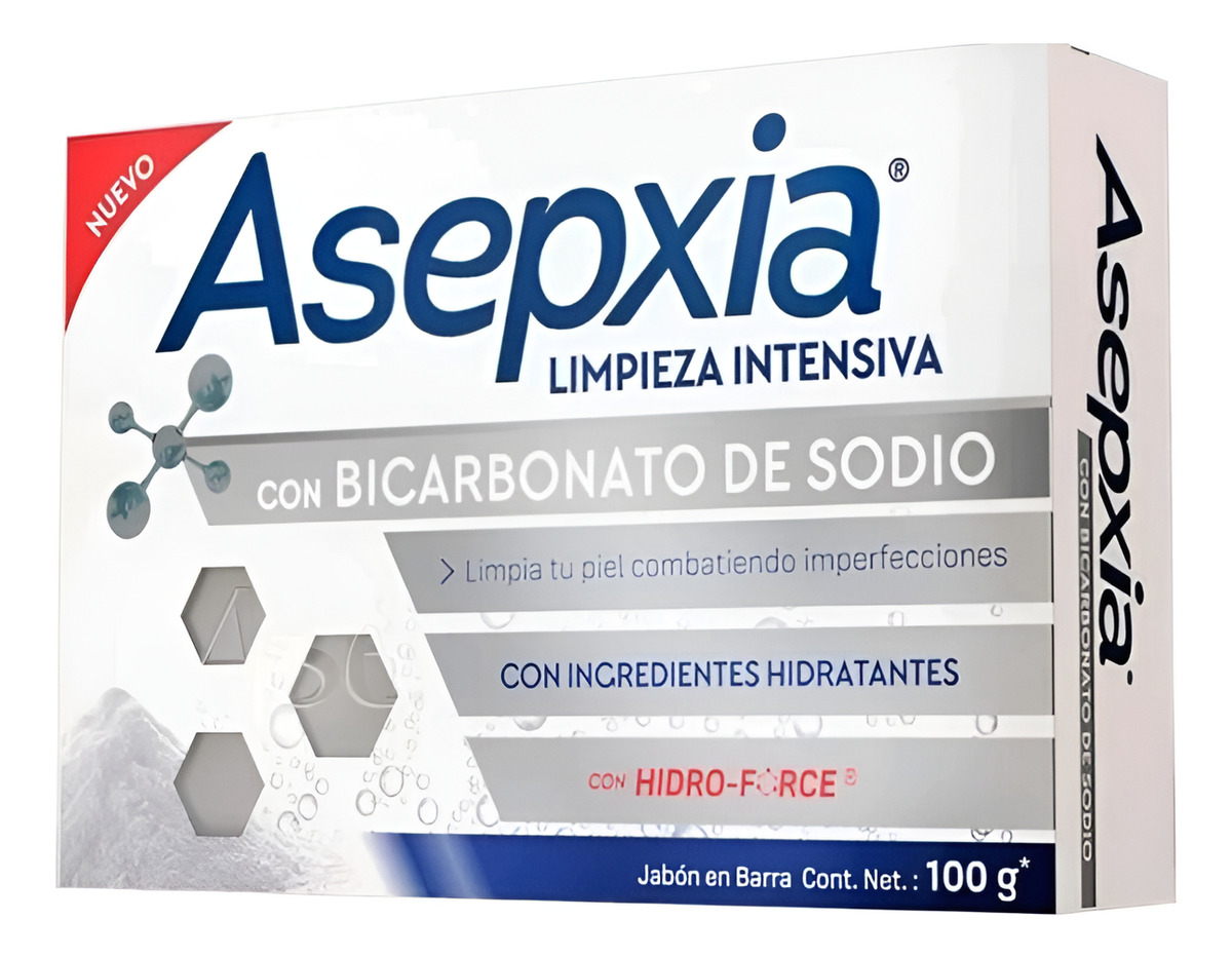 Incluye en tu rutina del día este jabón Asepxia Limpieza Intensiva para lavar tu cara, es ideal para usarlo en la mañana y en la noche. Cuenta con bicarbonato de sodio el cual actúa en los poros removiendo grasa e impurezas, además ayuda a limpiar profundamente tu rostro, asimismo previene aparición de imperfecciones.