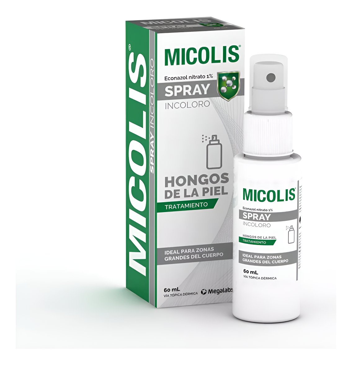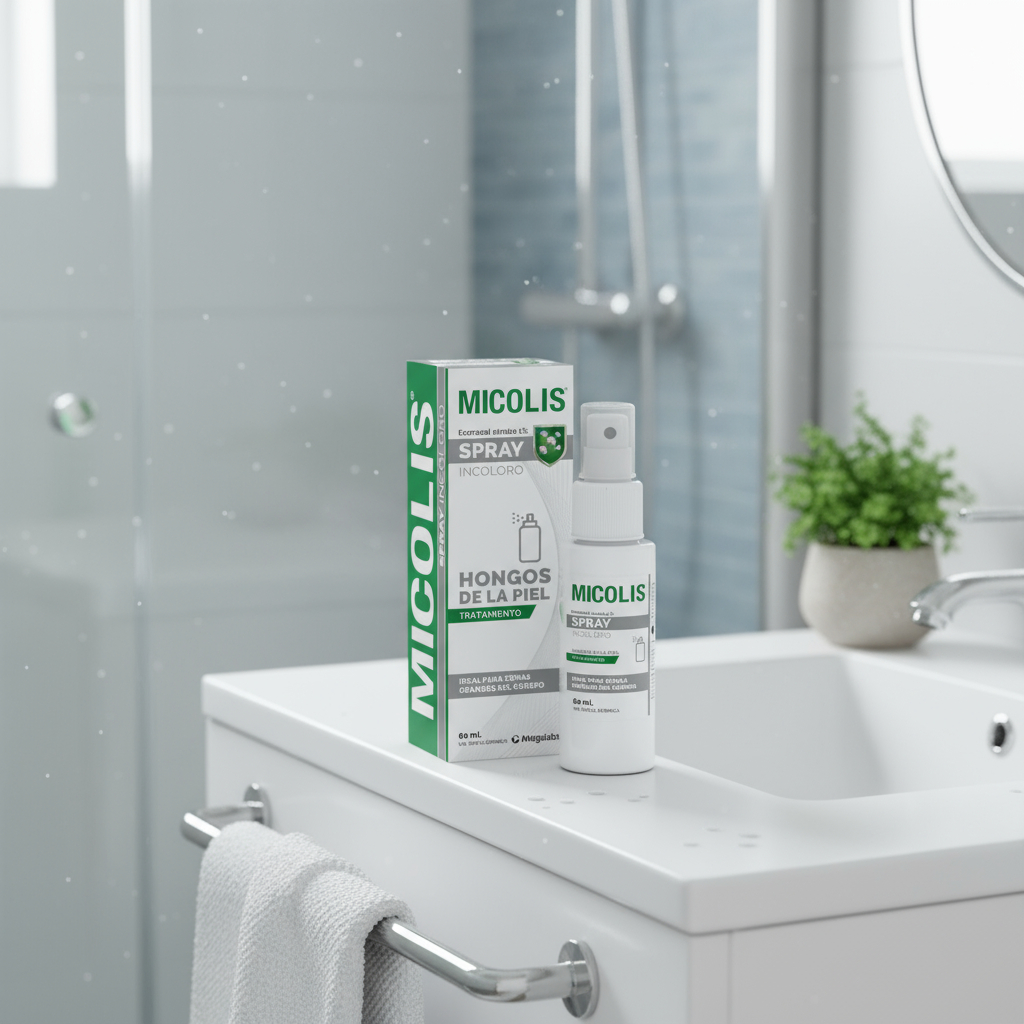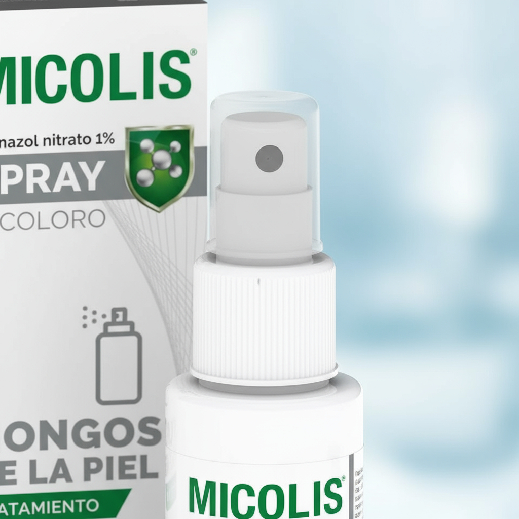 Micolis Spray es un spray tópico que contiene econazol al 1 g/100 ml, un antimicótico de amplio espectro y derivado imidazólico. Este medicamento actúa como fungistático o fungicida a dosis elevadas, inhibiendo la síntesis de ergosterol en la membrana celular de los hongos, lo que altera su permeabilidad y bloquea su crecimiento y replicación. Es eficaz en el tratamiento de diversas infecciones fúngicas superficiales, como tinea pedis, tinea cruris, tinea corporis, pitiriasis versicolor y candidiasis cutánea.