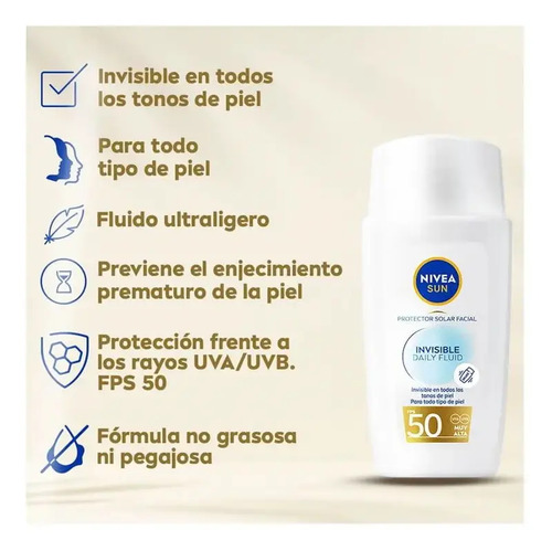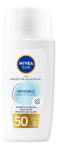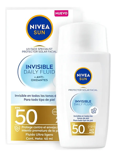 El Protector solar facial NIVEA SUN Invisible Daily Fluid protege la piel saludable desde el exterior frente a los rayos UVA/UVB y frente a los efectos de la luz visible de alta energía, como el envejecimiento prematuro de la piel. Su fórmula contiene Licochalcona A, un potente antioxidante natural que activa el mecanismo de defensa propio de la piel, y Niacinamida, que proporciona una piel visiblemente sana y un tono uniforme. No es graso, no es pegajoso y no deja residuos blancos. Proporciona un efecto mate durante 8 horas para un aspecto sin brillo, una sensación de piel hidratada y un aspecto de piel visiblemente saludable. Contiene FPS 50 y es invisible con todos los tonos de piel. Es adecuado para todo tipo de pieles