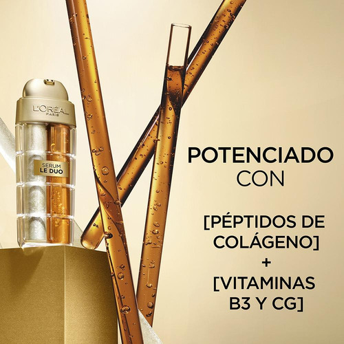 Descubre el poder del Sérum L’Oreal Le Dúo 30 ml, una innovadora fórmula que revitaliza tu piel gracias a su combinación única de péptidos de colágeno y vitaminas B3 y Cg. Este sérum está diseñado específicamente para mujeres mayores de 35 años, otorgando un tratamiento intensivo que mejora notablemente la firmeza y luminosidad de tu rostro. Con un aroma floral y una textura ligera, se absorbe rápidamente, brindando comodidad a tu rutina de belleza diaria. Dermatológicamente testeado, este producto también actúa como un potente aliado contra las arrugas y las manchas, promoviendo una apariencia más joven y renovada. Inicia tu transformación y disfruta de resultados visibles en apenas 7 días, con un 18 % de mejora en la firmeza, y en solo 4 semanas, experimenta una notable reducción de arrugas y una luminosidad incrementada de hasta el 87 %.