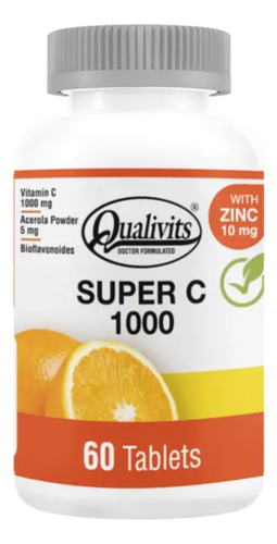 Super C – Vitamina C + Zinc – Qualivits® es un suplemento nutricional presentado en un frasco de 60 cápsulas. La dosis sugerida es de 1 comprimido al día con las comidas.