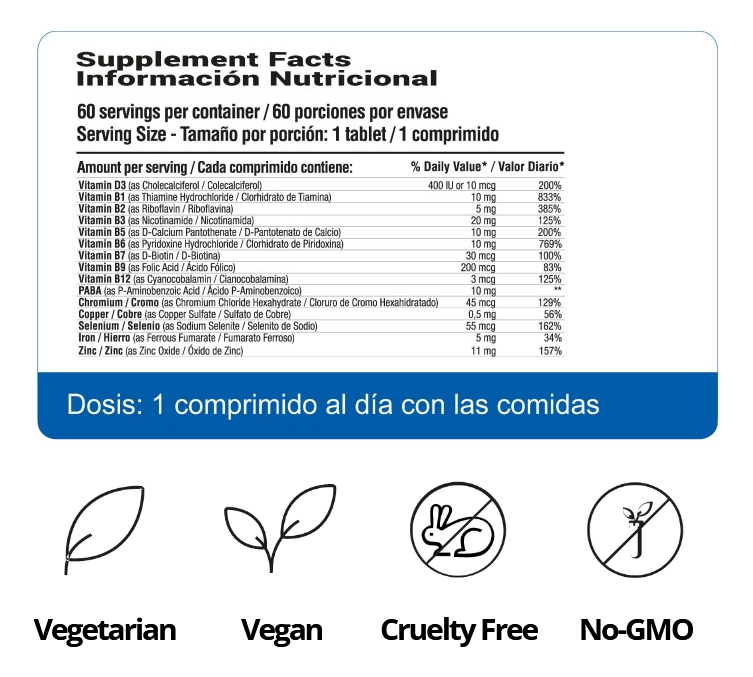 Cobre 0.5mg, Cromo 45mcg, Hierro 5mg, Paba 10mg, Por comprimido:, Selenio 55mcg, Vitamina b1 10mg, Vitamina B12 3mcg, Vitamina b2 5mg, Vitamina b3 20mg, Vitamina b5 10mg, Vitamina B6 10mg, Vitamina b7 30mcg, Vitamina b9 200mcg, Vitamina D3 10mcg, Zinc11mg