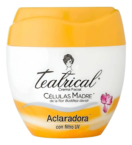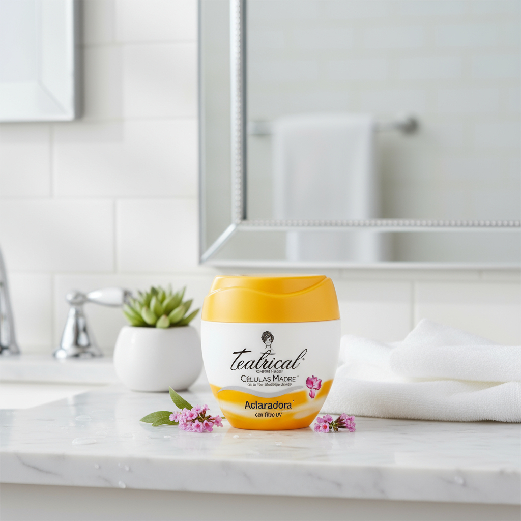 Crema Facial Ultra Aclaradora de Teatrical con filtro UV contiene ingredientes que actúan sobre las manchas de la piel reduciéndolas. … Estas células son utilizadas para producir bioactivos que ofrecen protección contra el foto-envejecimiento y los daños que este produce en la piel